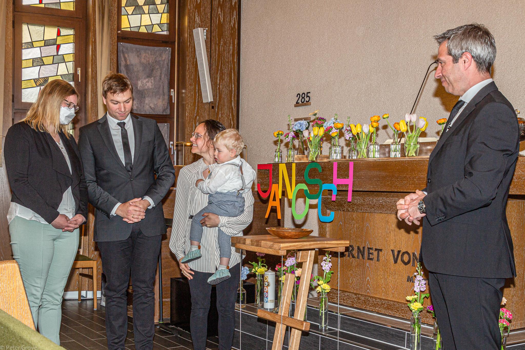 Die Taufpatin entzündet die schöne Taufkerze und nimmt ihre neue Aufgabe gerne an. Auch die Eltern versprechen, dass sie Janosch in die erfahrbare Welt Gottes begleiten werden.